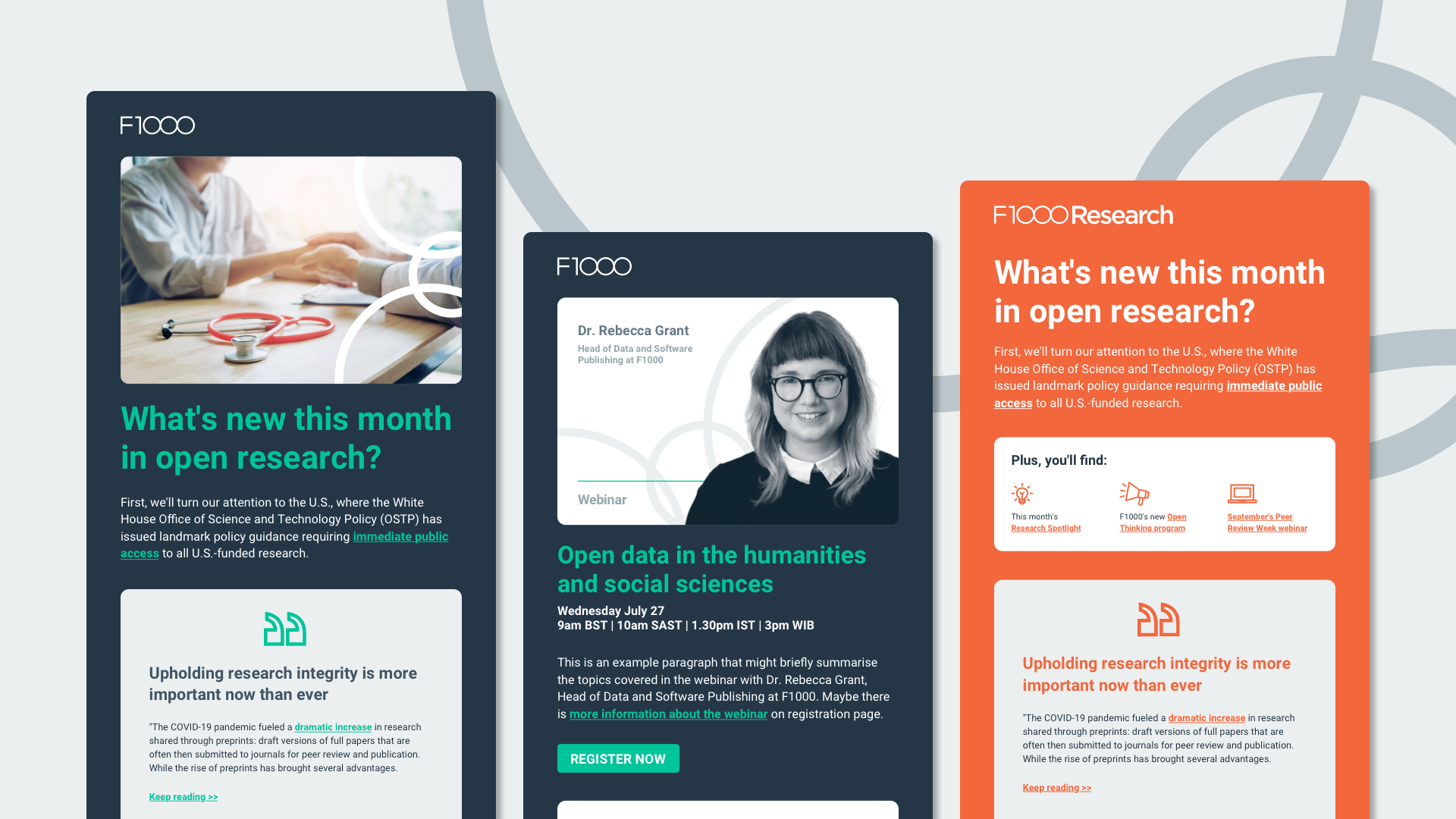 Through this redesign, all the templates are brought together and aligned to the brand guidelines. The final designs bring bold colour, more strategic imagery, and deliver information to readers more clearly through defined content blocks. This style was especially important due to the length and variety of content marketers are often required to include. Templates now share the same design with three feature options for events, diverse topics, or deep dives into a singular topic.