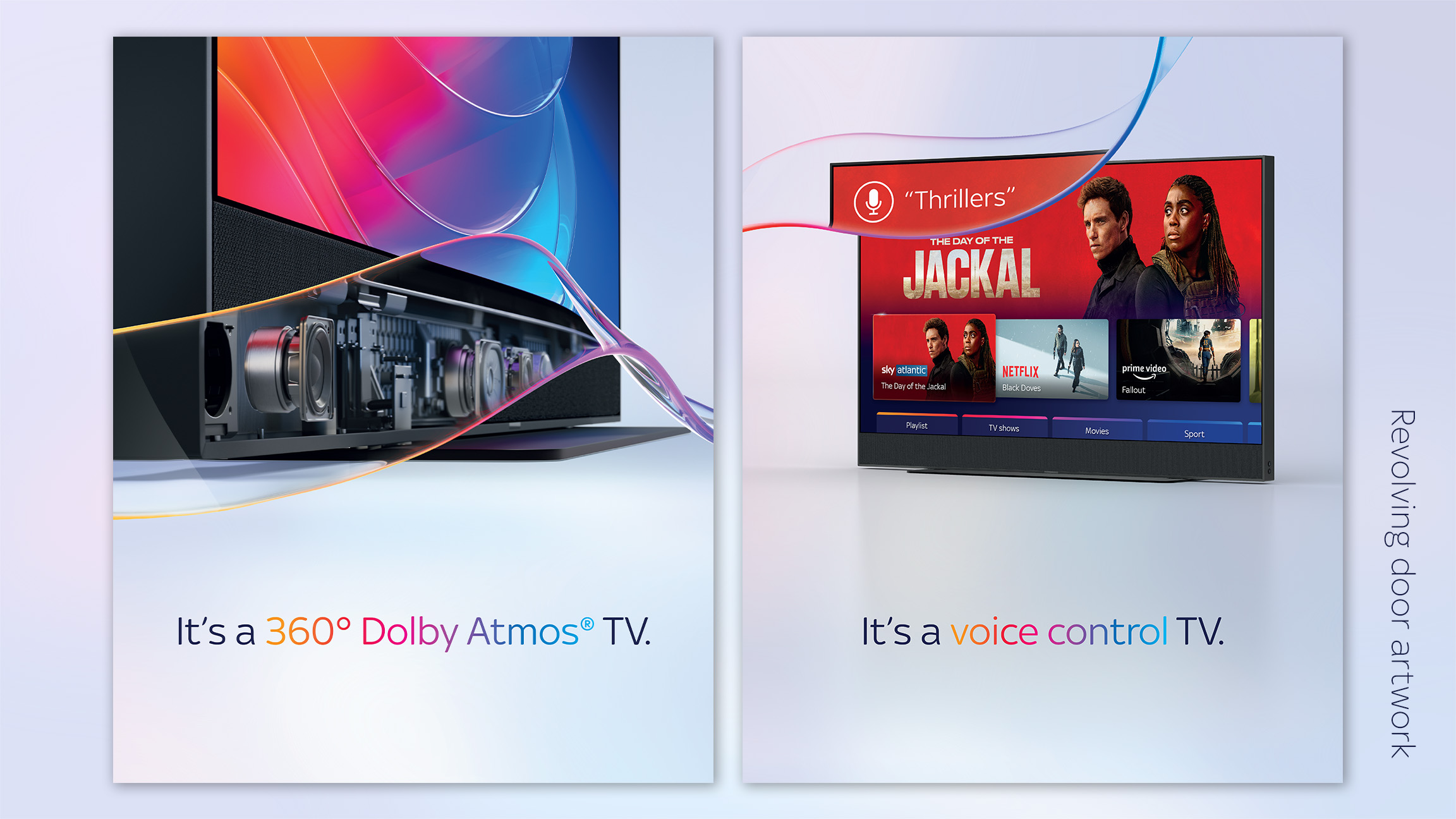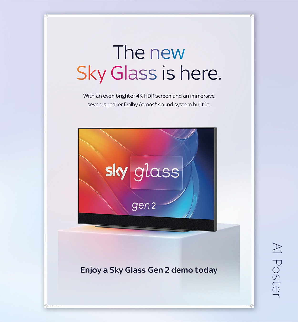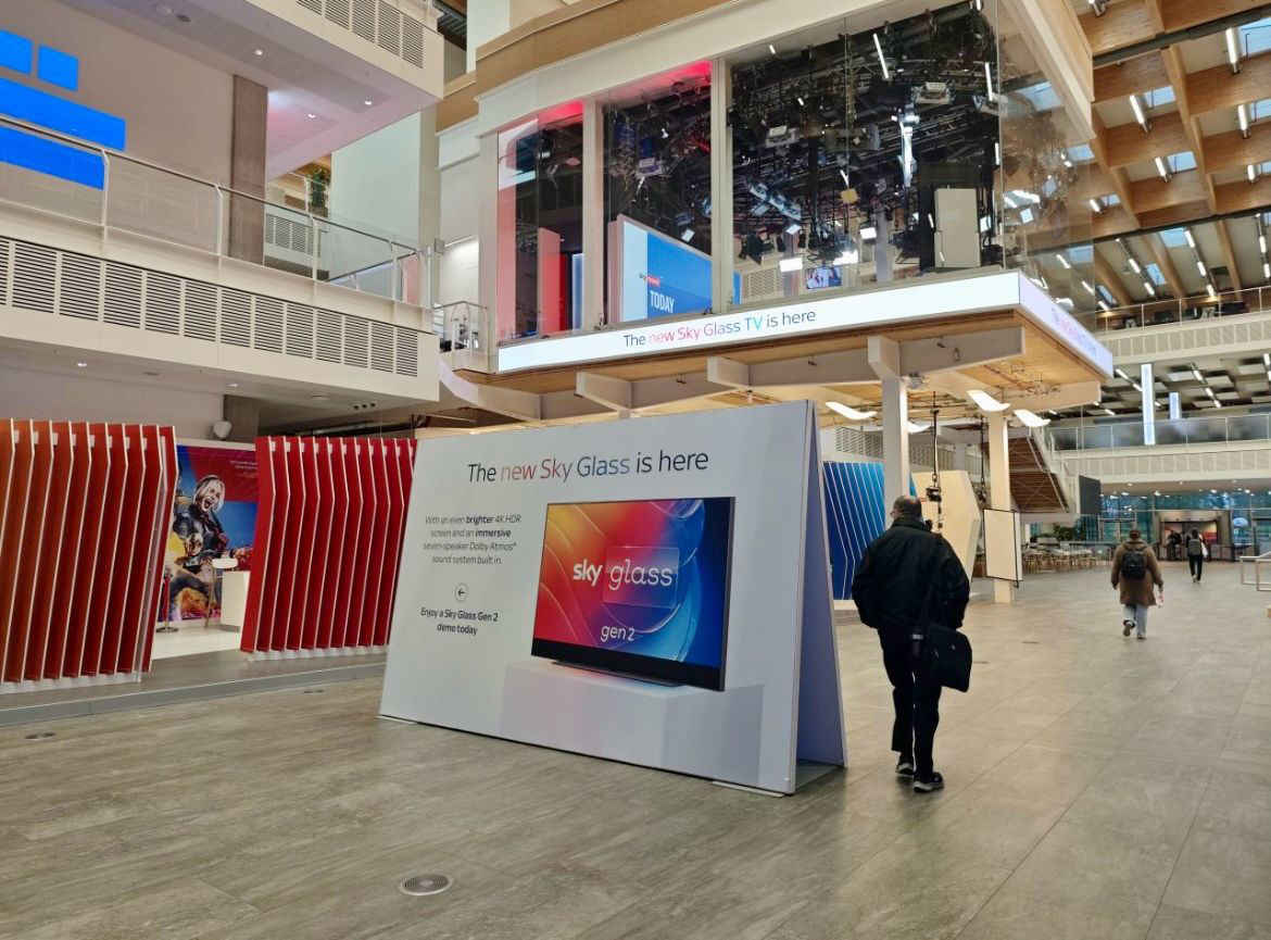 In celebration of the the launches of Sky Glass Gen 2 and Sky Glass Air in 2025, I worked on campus and digital campaigns, and on a media event for press. Designing and art working large-scale print graphics installed across campus doors and lifts, editing video interviews, supporting with the announcements on our intranet, and supporting on a high end presentation to be given by Sky’s Managing Director of Sky TV and Now, and the Managing Director of Global Product Management.